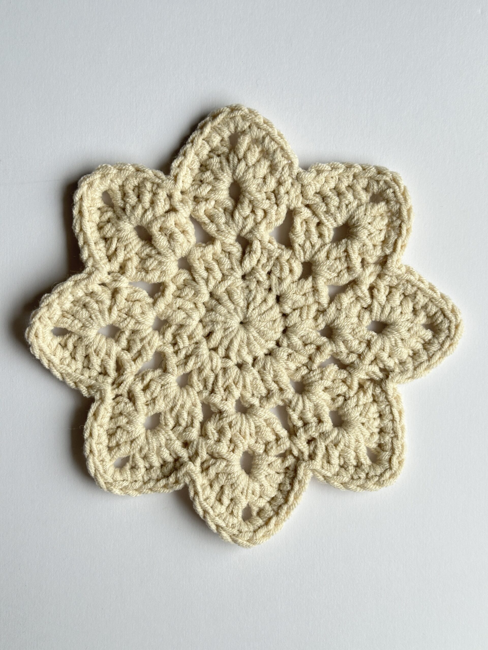 Ręcznie robiona, szydełkowa podkładka w kwiatowym kształcie, która łączy funkcjonalność z dekoracyjnym detalem. Chroni powierzchnię stołu i wprowadza do wnętrza ciepły, codzienny klimat.