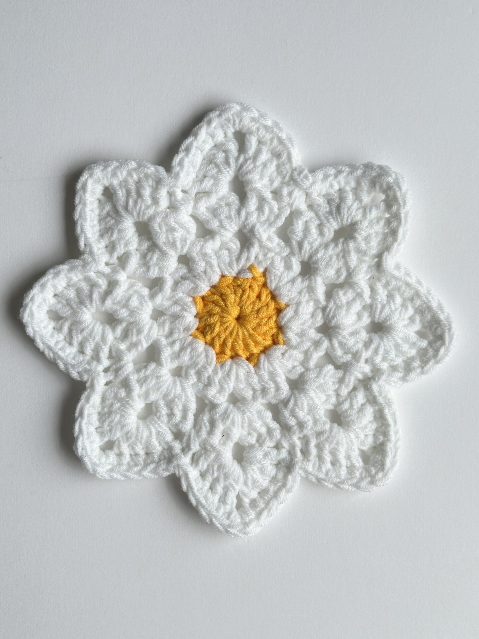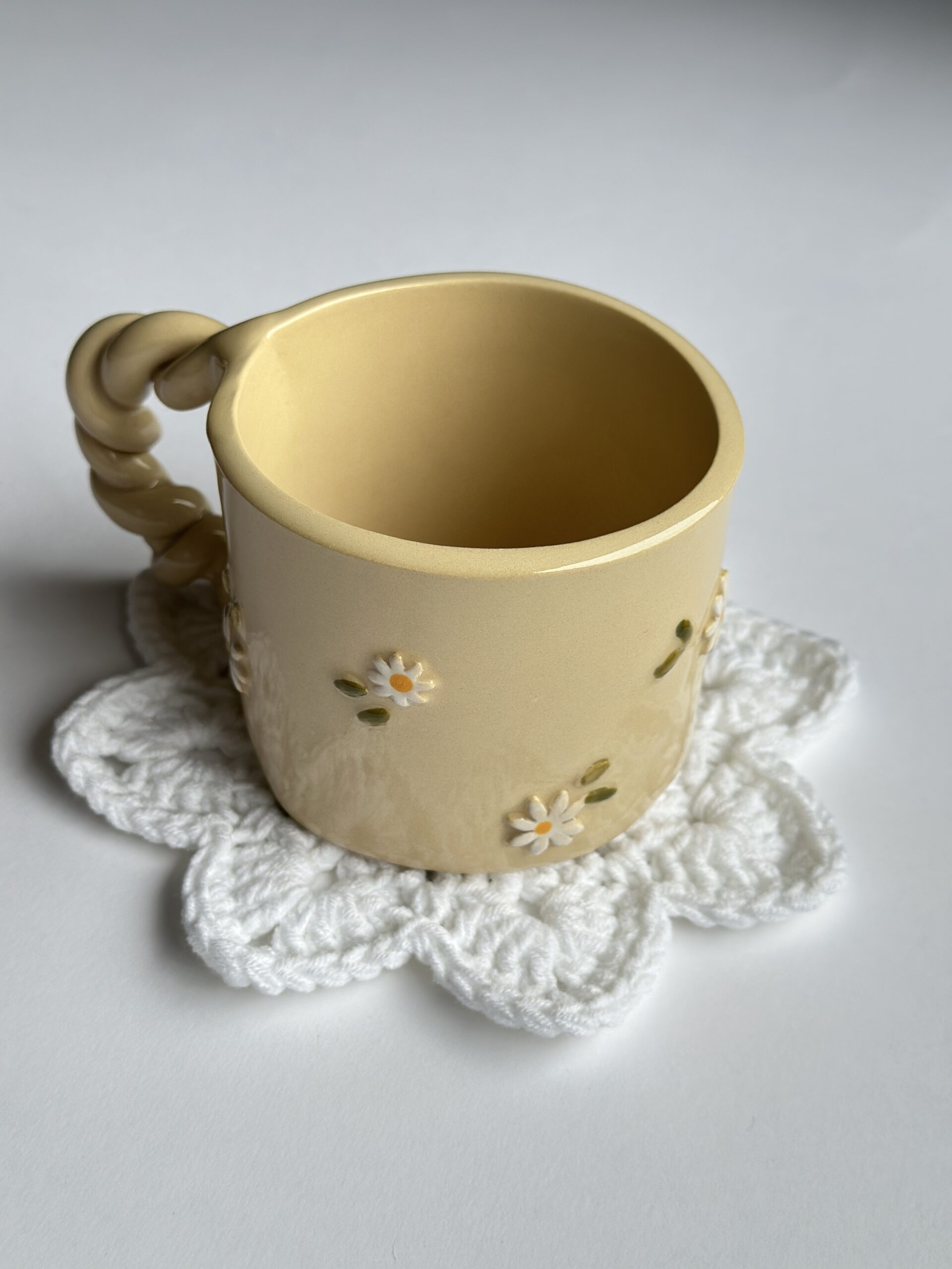 Szydełkowa podkładka pod kubek handmade – stokrotka